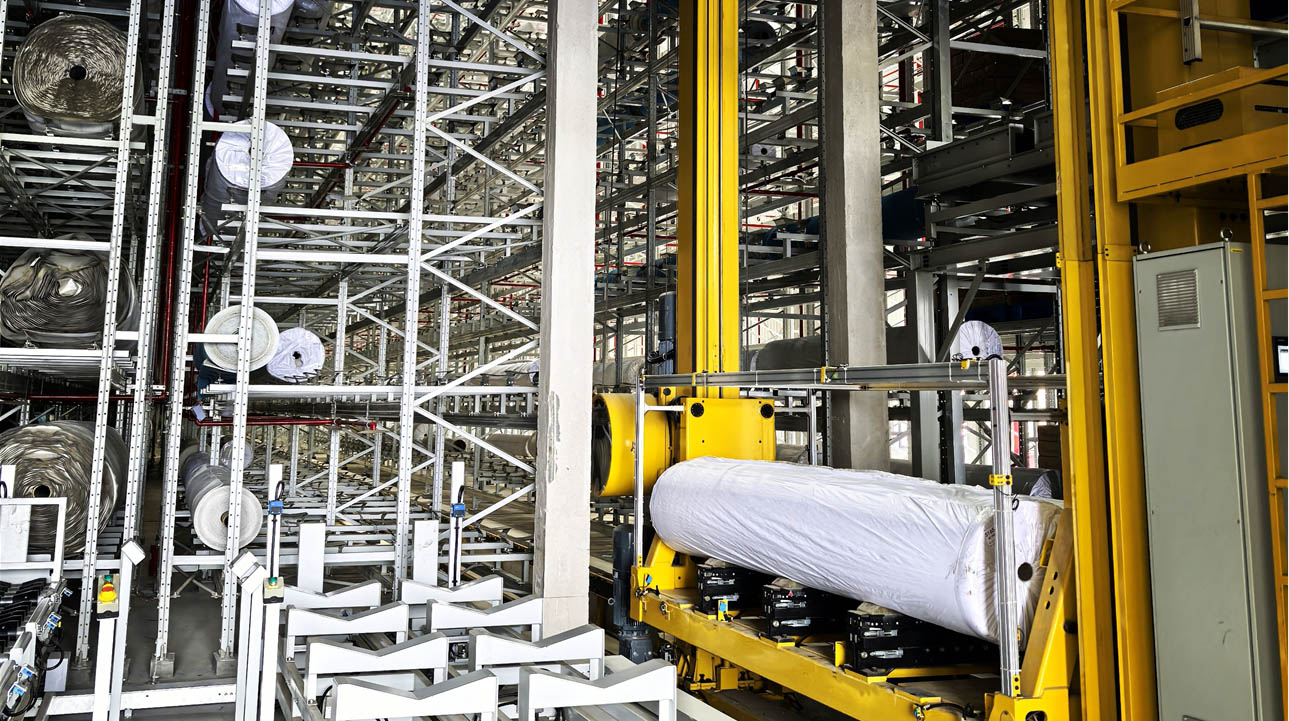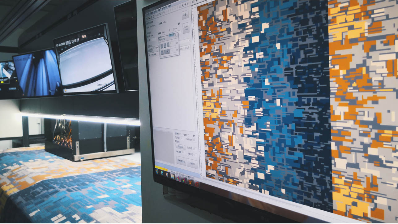 鴻成為國內首家立庫與產線深度結合的地毯制造商,通過現場WCS,WMS,與我們自主研發的生產控制軟件,我們實現了95%的產線物料進與出相關的自動化,包括簇絨,印花,方塊地毯的自動上下料,下機檢驗的自動輸送線,KBK支架等。